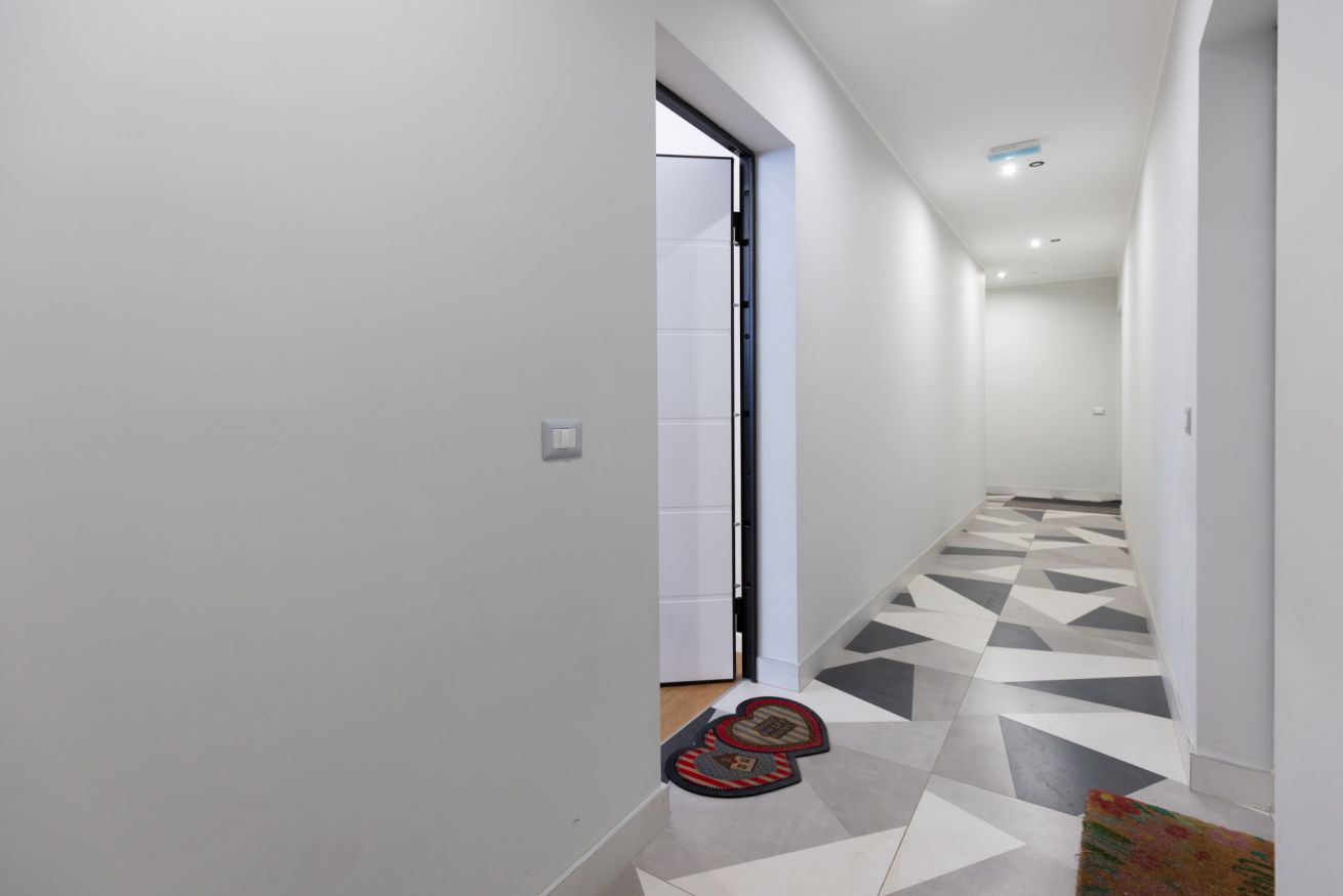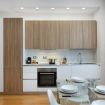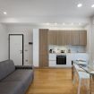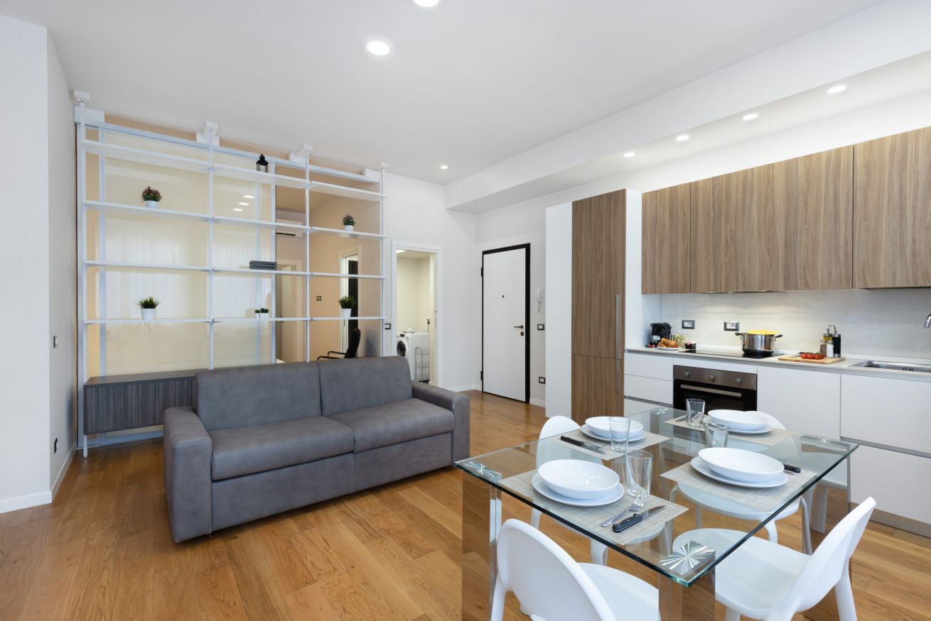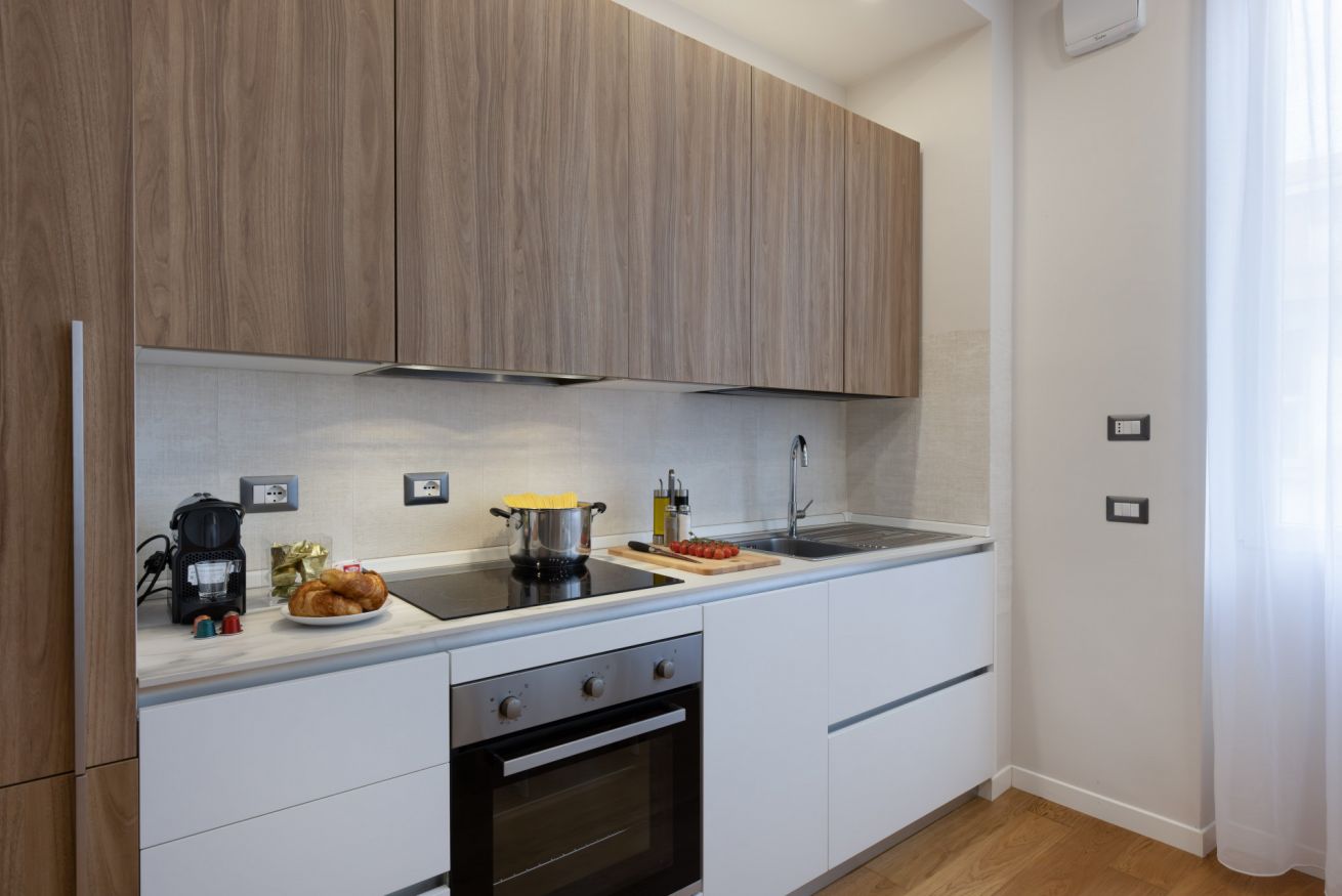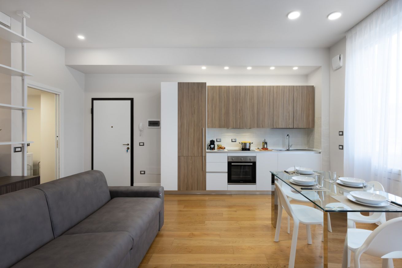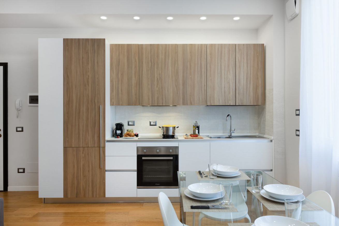 La porta d'ingresso si affaccia sulla zona giorno con ampio soggiorno e cucina a vista, accessoriata di tutto l’occorrente per cucinare e mangiare. E' presente un piano cottura a induzione, frigorifero, freezer, forno e macchina del caffè a capsule.