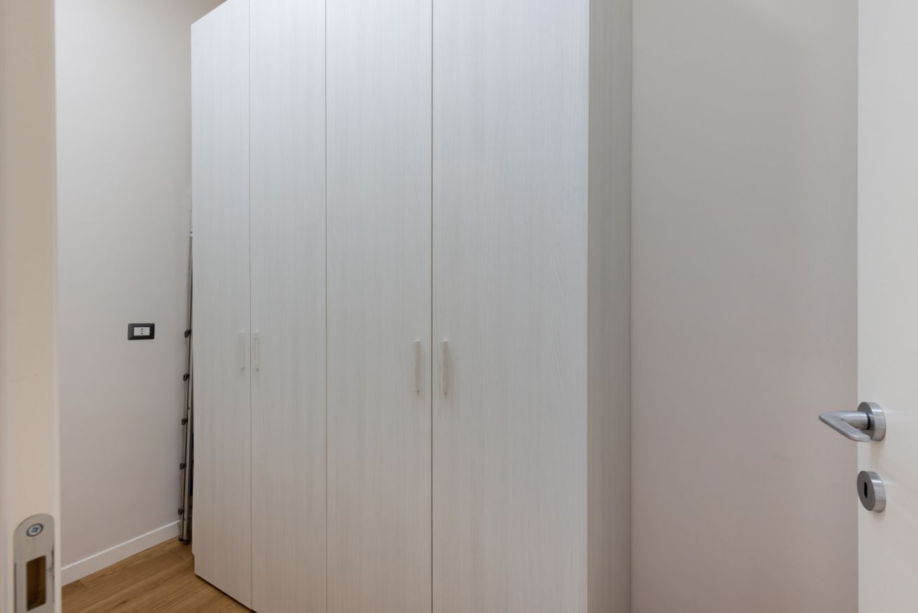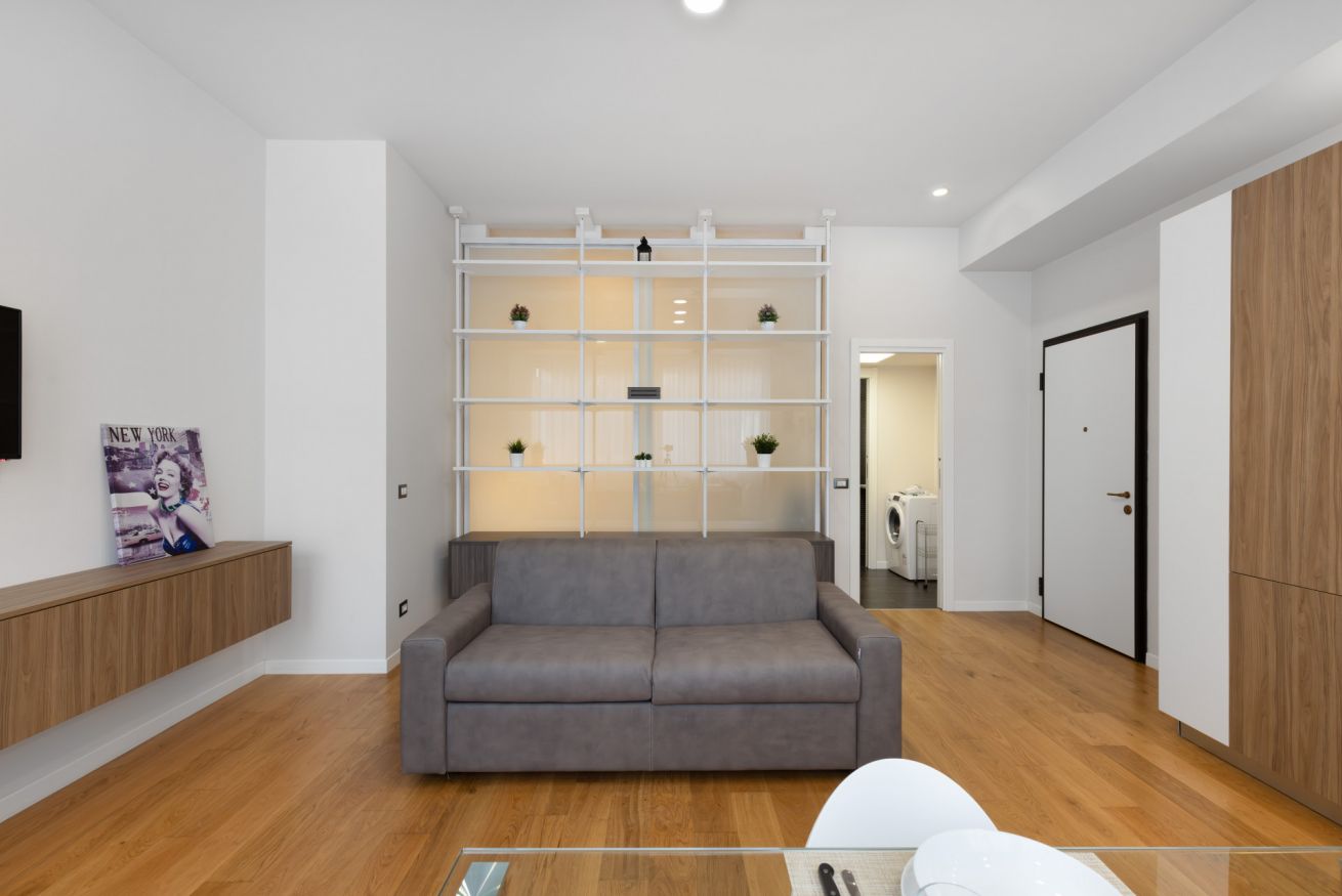 Il soggiorno e la camera da letto sono separati da un elegante e solido divisorio con binario, con possibilità di aprirlo o chiuderlo a proprio piacimento. Dalla camera matrimoniale si accede alla stanza con ampio armadio per riporre i vestiti.
