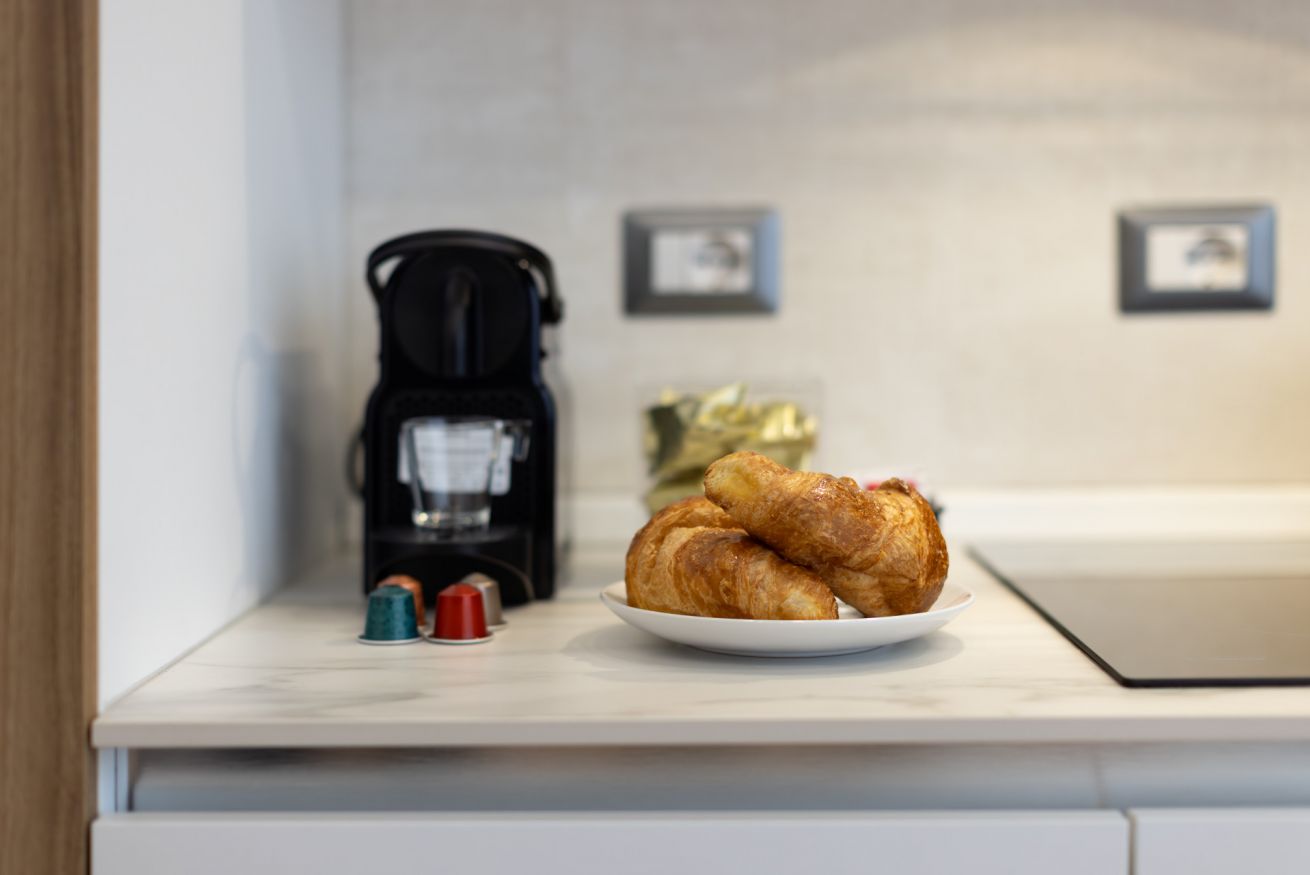 Per il primo giorno di permanenza offriamo capsule caffè, detersivo piatti, tabs per lavastoviglie, tabs per lavatrice, sapone, bagnoschiuma e shampoo.