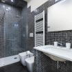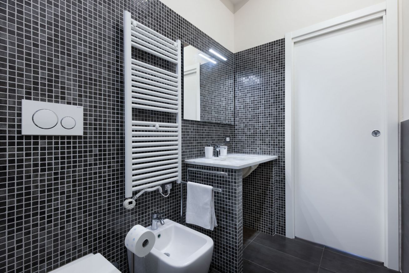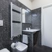 L'ampio bagno è stato realizzato con uno stile che ricorda le spa; dispone di un lavandino, water, bidet e ampio box doccia.