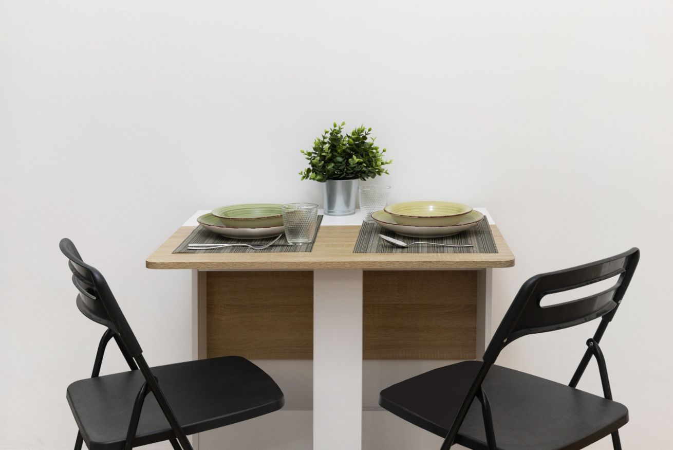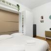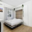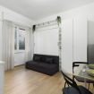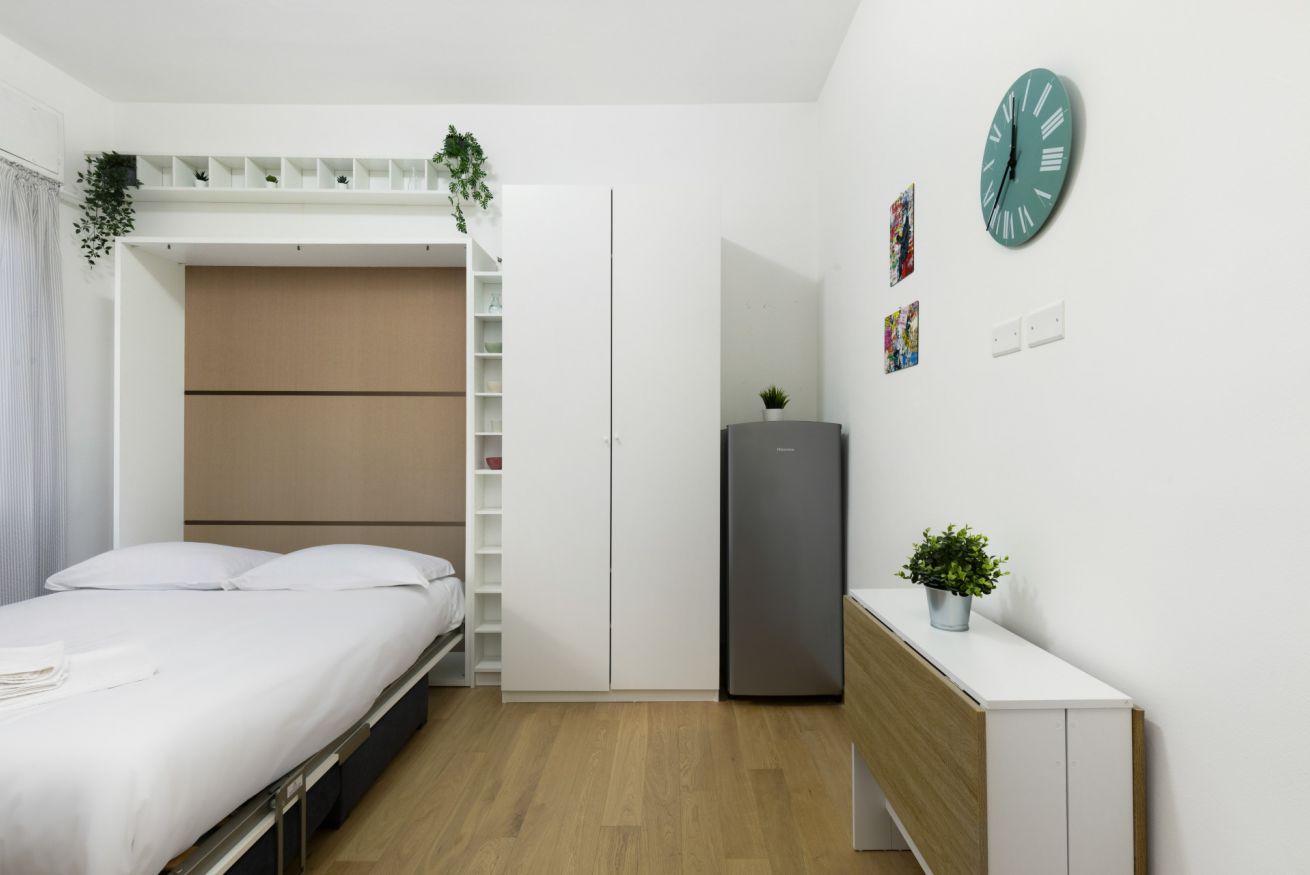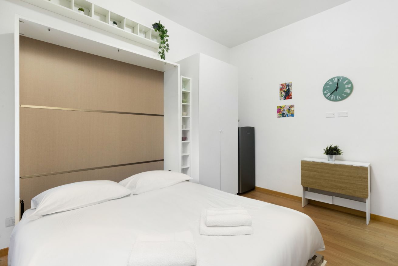 Il letto matrimoniale a scomparsa si apre e si richiude facilmente, lasciando spazio durante il giorno. Con la chiusura de letto è possibile utilizzare il piccolo divano durante le ore giornaliere.